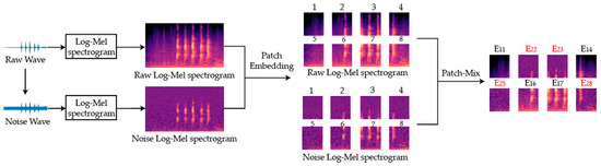 During the extraction of the Log-Mel spectrograms, background noise is mixed among the audio. Then, both the original audio and the corresponding noise-added audio waveforms are converted into 128-dimensional log-Mel filter bank (Fbank) feature sequences [20], with window and overlap sizes set to 25 ms and 10 ms, respectively. The Patch-Mix operation is applied on the obtained original audio Log-Mel spectrograms and the corresponding noise-added Log-Mel spectrograms to obtain the final mixed features.