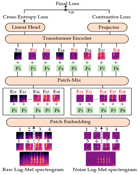 First, the model executes Patch Embedding on the input spectrogram, dividing it into a series of patches and adding learnable positional encodings to each patch. Then, Patch-Mix operation is carried out, mixing patches from the original spectrogram and the noisy spectrogram. These mixed patches are used as inputs to the Transformer encoder. Drawing upon the encoder’s refined outputs, the model concurrently calculates both cross-entropy loss and contrastive loss, each uniquely encapsulating disparate information of the learning objective. Judging by a strategic redistribution and harmonious fusion of these two loss functions, we derive the definitive final loss, which subsequently steers the training trajectory of our method with superb accuracy.