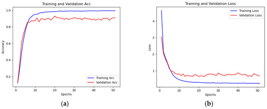 The baseline model AST is initially used for sound classification in the AudioSet dataset and then applied to downstream tasks through transfer learning. Therefore, it is necessary to verify whether transfer learning affects the model’s performance. The pre-trained AST model is fine-tuned for 50 epochs, while the non-pre-trained AST model is trained from scratch for 200 epochs. Exponential learning rate decay and a warm-up period are used to optimize the training process, with an initial learning rate of for the pre-trained AST and for the non-pre-trained AST. The experimental results are shown in Table 3.