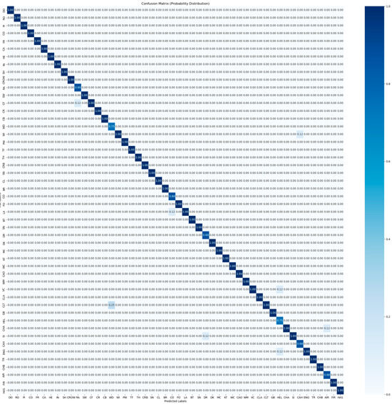 Confusion matrix of the CL-Transformer framework on the ESC-50 validation set. To enhance visualization, we mapped the label values on the horizontal and vertical axes to the abbreviations of each category. DO: Dog; RO: Rooster; PI: Pig; CO: Cow; FR: Frog; CA: Cat; HE: Hen; IN: Insects; SH: Sheep; CROW: Crow; RA: Rain; SW: Sea waves; CF: Crackling fire; CR: Crickets; CB: Chirping birds; WD: Water drops; WI: Wind; PW: Pouring water; TF: Toilet flush; TH: Thunderstorm; CRB: Crying baby; SN: Sneezing; CL: Clapping; BR: Breathing; CO: Coughing; FO: Footsteps; LA: Laughing; BT: Brushing teeth; SN: Snoring; DR: Drinking; DK: Door knock; MC: Mouse click; KT: Keyboard typing; WC: Wood creaks; CAO: Can opening; WM: Washing machine; VC: Vacuum cleaner; CLA: Clock alarm; CLT: Clock tick; GB: Glass breaking; HEL: Helicopter; CHA: Chainsaw; SI: Siren; CAH: Car horn; ENG: Engine; TR: Train; CHB: Church bells; AIR: Airplane; FIR: Fireworks; HAS: Hand saw.