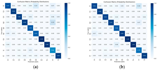 Confusion matrices on the UrbanSound8K validation set with different SNRs. (a) Confusion matrix with SNR of 0 dB; (b) Confusion matrix with SNR of 10 dB.