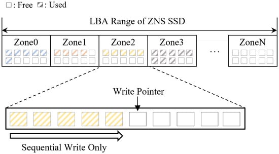 Meanwhile, the performance of random writes in SSDs still remains a critical concern. In addition, many researchers and engineers have reported that random writes can hurt the limited lifespan by triggering extra erase operations [47,48,49]. There are numerous research and commercial efforts to improve the performance of random writes so far. Researchers have focused on the storage stack (e.g., page cache, file system, and block I/Os), and they proposed new mechanisms and algorithms to enhance the performance of random writes. For example, F2FS is one of the flash-friendly file systems, and it follows the basic rules of a log-structured filesystem (LFS) to handle all write requests in sequential order [50]. Some researchers have focused on the NVMe interface and internal architecture of the traditional SSDs. As a result, zoned namespace (ZNS) SSDs have recently emerged as a new type of SSD device; it fundamentally addresses the issues about random writes in the hardware layer.