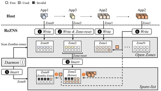). Next, the daemon of ReZNS inserts Zone0, which has not used for one hour, into the spare-list by identifying it as a zombie zone(Step