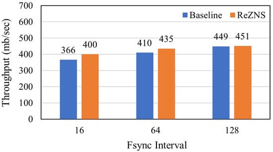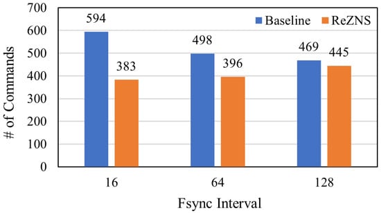 Figure 3 shows the performance results over varying the fsync interval. As shown in Figure 3, ReZNS shows the best performance in all cases, but the performance gap highly depends on the period of fsync; it outperforms the conventional ZNS SSD by up to 9%, 6%, and 1% for 16, 64, and 128 intervals, respectively. To understand the reason in detail, we monitored and quantified the number of the zone-reset commands on NVMeVirt [28]. Figure 4 shows our evaluation results where the number of zone-reset commands decreases as the fsync interval increases. In addition, the gap between ReZNS and the baseline narrows down as the period of fsync increases.