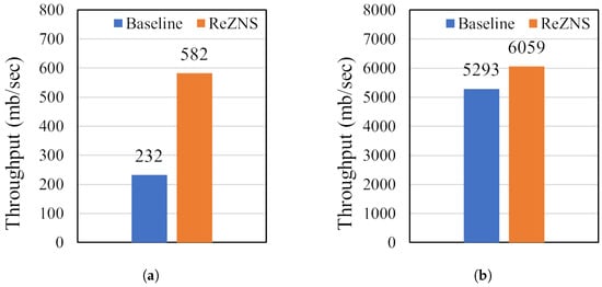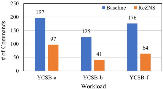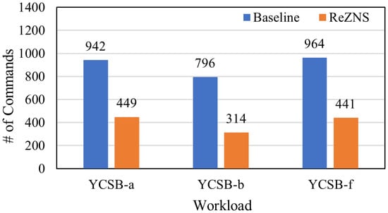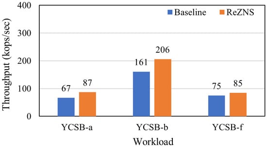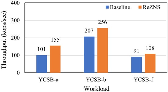 Figure 7 and Figure 8 plot the throughput and the number of zone-reset commands of all workloads. As expected, ReZNS is the winner in all cases (see Figure 7); it improves the baseline’s performance by up to 35%, 19%, and 16% for YCSB-A, YCSB-B, and YCSB-F, respectively. As mentioned above, it is reasonable that ReZNS shows good performance compared with the baseline in the write-heavy workloads (i.e., YCSB-A and YCSB-F). Surprisingly, ReZNS also provides better performance on the YCSB-B workload. To understand the reason, we investigated I/O requests from the workload and figured out that the performance gain comes from the 5% write requests of the total YCSB-B workload. This is extremely important in that the small amount of writes can achieve 19% performance improvement. Meanwhile, Figure 7 shows different performance results even though YCSB-A and YCSB-F have the same read–write ratio of 1:1. The main reason is that the YCSB-A workload is composed of read and write operations, but YCSB-F includes a set of read–modify–write operations, which may have a different CPU overhead.