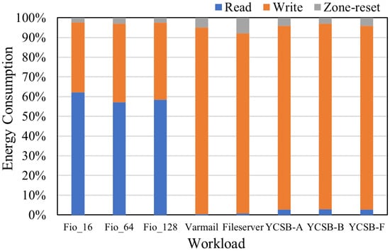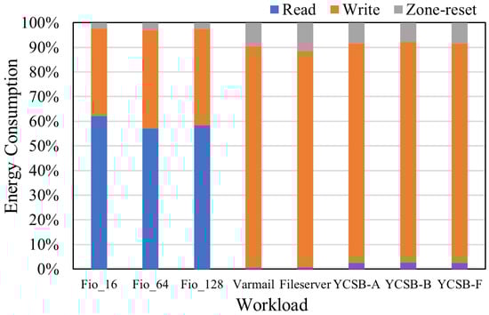 To understand why the energy gap in Figure 11 is very close, unlike that of performance, we investigated the details of where the energy is mainly consumed. Figure 12 and Figure 13 show the breakdown of energy consumption in percentage on all workloads on ReZNS and baseline, respectively. In the figures, the portion colored in gray represents the energy consumed by zone-reset commands. As expected, most of the energy is consumed by the read and write operations, whereas zone-reset drains only a few joules. Meanwhile, as shown in Figure 13, the portion of zone-reset commands is larger than that of ReZNS. To clearly understand the difference, we look into the amount of energy that comes from zone-reset commands (see Figure 14). Unlike the results in Figure 11, ReZNS shows the best energy efficiency in all workloads. Interestingly, Figure 12 shows that ReZNS can save on power consumption by up to 64% while running YCSB-B for 20 min. The reason behind this drop is that ReZNS lets multiple applications recycle the remaining space in each zone instead of performing zone-reset commands. In summary, the more often the zone-reset command is triggered after frequent write operations, the more ReZNS can save energy consumption. This is because ReZNS absorbs many of the write operations using renewable zones and avoids triggering the zone-reset commands that require high energy consumption. We believe it becomes more meaningful as the attention to energy efficiency inside the storage devices increases.