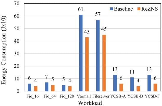 Figure 11 compares the total estimated energy consumption for eight workloads, where lower is better. As shown in Figure 11, ReZNS delivers similar or better energy costs than the baseline except for the results of Filebench. The reason for the high energy consumption from Filebench is that the benchmark ran for 1 min based on time. This means that ReZNS handles more operations than the baseline at any given time because of its high performance, as shown in Figure 5. As a result, the graph confirms the positive effect of saving energy, which comes from ReZNS. Meanwhile, ReZNS saves on total power consumption by up to 3% compared with the baseline on the YCSB-F workload. This is quite encouraging in that the YCSB benchmark approximately ran for 20 min. When considering that datacenters always turn on and work, we would expect that the energy advantage of ReZNS continuously increases over time.