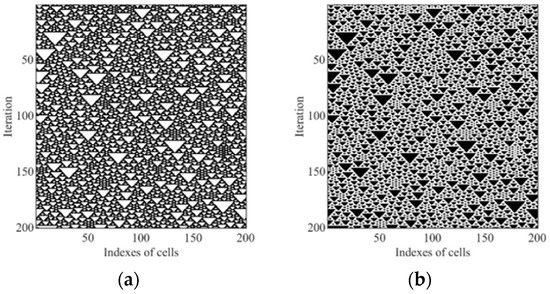 The iterative results of ECAs with rules (a) No. 126 and (b) No. 129. The black (white) lattice represents the cell with the status value “1” (“0”).