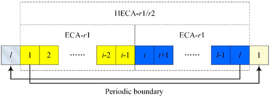 Although the chaotic ECA possesses a long period, the period is still limited and cannot meet the requirement of pseudo-randomness. Thus, we designed the hybrid ECA (HECA) in our previous work [39]. The HECA consists of two ECAs with different rules. The structure of a HECA is shown in Figure 2.