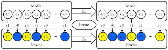 In Figure 3, the mask is iterated under the cell rule rm, which is a constant. The cell rule rd in the driving part is changed with the status value of the cell in the mask. As for cell Ci in the driving part, the index d of the cell rule is determined by the status value of cell Ci in the mask. Furthermore, the mathematical expression of the iterative process in the driving part is shown in Equation (3).