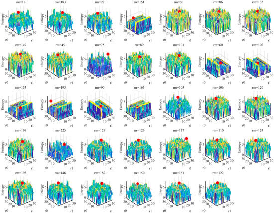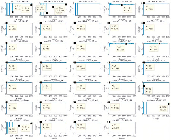 We assign the number of cells to 100 in the driving or mask parts. Two binary numbers with 100 bits generated randomly are utilized to initialize the HECA-M. Moreover, we select three global chaotic rules from Table 3 to compose the rule group. Thus, there are 39,304 (34 × 34 × 34) groups. The IEs of each rule group are shown in Figure 4.
