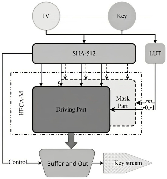 Secondly, a novel stream cipher based on HECA-M and the HASH function is proposed in this paper. Moreover, a buffer used for controlling the output of the keystream is also included in the proposed stream cipher. A secret key called seed and a constant binary vector IV are used as the input of the stream cipher. The SHA-512 belonging to the provable secure HASH function is chosen for acquiring the initial value of the HECA-M from the input. The existence of IV and the HASH function can avoid the weak key effectively. Meanwhile, good diffusion can be provided by the SHA-512. Furthermore, the Hamming weight of the input is utilized to choose the rule group for the HECA-M from LUT, enhancing the stream cipher’s security. Then, the original keystream is generated by the iteration of the HECA-M. The buffer related to the initial value of the HECA-M determines the initially removed iteration and the final keystream generated by the cells with odd or even indexes. This design can hide the initial state values of the HECA-M and resist the GDA.