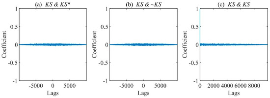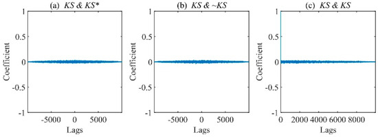 In Figure 9 and Figure 10, the X-axis and Y-axis represent the lags and correlation coefficient, respectively. As shown in Figure 9a,b and Figure 10a,b, no matter how long the secret key is, the cross-correlation coefficients between KS and KS*, ~KS, are close to zero. Moreover, in Figure 9c and Figure 10c, the autocorrelations of KS are approximately equal to zero. Hence, the keystream generated by the proposed stream cipher is sensitive to the secret key. A slight change in the secret key can lead to a completely different keystream. Furthermore, the keystream generated by the inverse of the secret key is also independent of the original keystream KS. In other words, it is difficult for the enemy to find the laws of the secret key from the different keystreams.