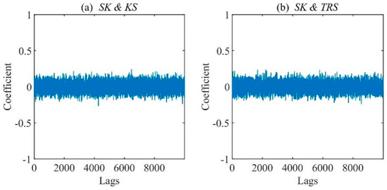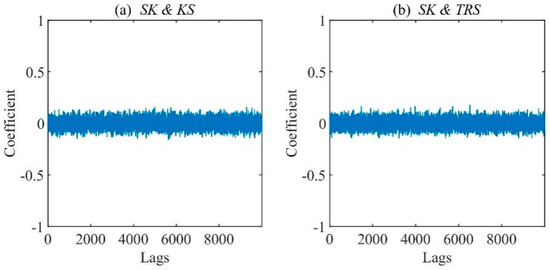 The X-axis and Y-axis denote the lags and the correlation coefficient, respectively, in Figure 11 and Figure 12. These two figures show that the correlation coefficient between the secret key SK and the corresponding keystream KS is similar to the correlation coefficient between SK and the true random sequence TRS. In order to prove the similarity between the above two correlation coefficients further, the t-test is utilized to determine whether these two coefficients possess the same statistical characteristics. The significance level α is set to 0.05, and the mean is zero. The test is operated five times with different SKs. The results of the t-test are listed in Table 9.