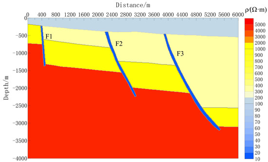 Geological model depicting three faults (F1, F2, and F3) with varying dip angles and resistivity distribution used for forward modeling.