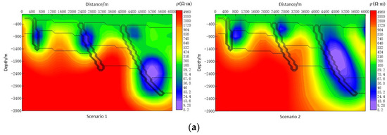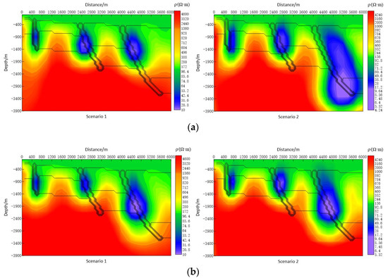 Inversion resistivity profile at different observation frequency bands. (a) The observation frequency band is 0.01–100 Hz. (b) The observation frequency band is 0.001–1000 Hz.