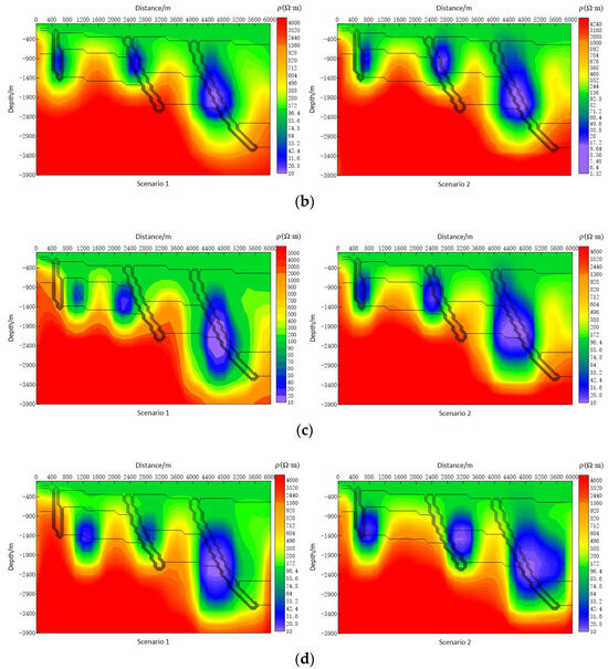 The magnetotelluric inversion results (Figure 2a–d) highlight the effect of station spacing on detecting low-resistance fault zones. The station spacings tested range from 200 m to 800 m, and the results consistently show that even at depths of up to 3 km, the linear structure of the faults can be effectively captured. These findings demonstrate the robustness of the employed inversion method across various station spacings, particularly in delineating fault zones spanning shallow to deep subsurface layers.