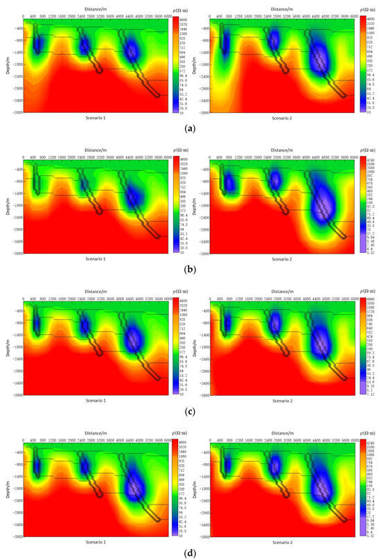 Inversion resistivity profile of different station spacings. (a) Station spacing is 200 m. (b) Station spacing is 400 m. (c) Station spacing is 600 m. (d) Station spacing is 800 m.