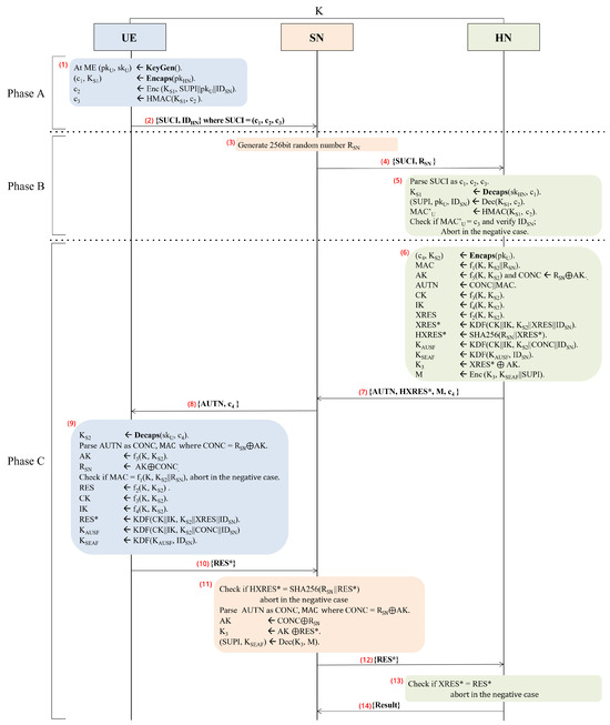 - Vuppala, R.C.; Kumar, D.; Je, D.; Sharma, N.; Nigam, A.; Kim, D. Post-Quantum Secure Hybrid Methods for UE Primary Authentication in 6G with Forward Secrecy. In Proceedings of the GLOBECOM 2023—2023 IEEE Global Communications Conference, Kuala Lumpur, Malaysia, 4–8 December 2023; pp. 2590–2595. [Google Scholar] [CrossRef]