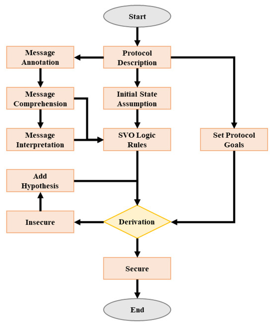 The verification process in SVO logic begins with the initial state assumption, where the initial conditions of the protocol are established. Then, the protocol messages are processed through annotation, comprehension, and interpretation, allowing for the logical representation of the protocol’s actions. Following this, the protocol’s goals are defined, and derivation is performed according to the SVO rules. If the derivation is successful, the protocol is considered Secure; otherwise, it is marked as Insecure. In cases of insecurity, hypotheses are added iteratively until the protocol reaches a secure state. Figure 4 illustrates the inference step of SVO logic.