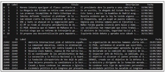 - Date (Fecha in Figure 1): The publication date of the news articles in DD/MM/YYYY format, commonly adopted in Spanish.