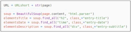 - Richardson, L. Beautiful Soup Documentation. 2004. Available online: https://www.crummy.com/software/BeautifulSoup/bs4/doc/ (accessed on 1 November 2023).
