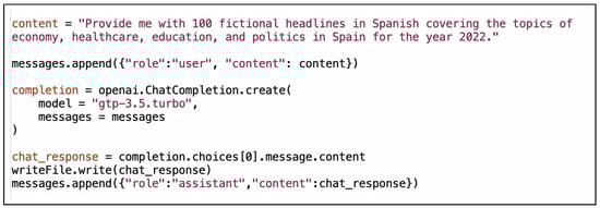 - Finally, due to the lack of publicly available repositories of political fake news in Spanish, we employed a hybrid approach to generating misleading content. This approach involved two distinct methods. The first method utilized the generative capabilities of AI, particularly a Generative Pre-trained Transformer (GPT) model, to automatically create a multitude of varied headlines. By using the OpenAI library, we generated fake headlines that closely mimicked the style and structure of real news articles (Section 3.2.3). The second method involved making strategic alterations to real news articles to create misleading information. These alterations typically included changing the names of political leaders or parties, as well as modifying key figures such as unemployment rates or dates, thereby creating plausible but false representations of political events. More detailed explanations of these methods are provided in Section 3.2.4.