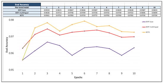 - Available BERT models. On one hand, there are two variants of BERT, known as BERT-base and BERT-large. Both are bidirectional models pre-trained on extensive text data in English, serving as the foundation for fine-tuning in a wide range of NLP applications. Specifically, BERT-base is the lighter version with fewer parameters (110 million), resulting in a smaller model size. In contrast, BERT-large is a more substantial and powerful iteration, boasting more parameters (340 million) and greater representational capacity. As a consequence, BERT-large proves more effective but also demands more computational resources, making it the preferred choice for complex natural language processing tasks. Moreover, in addition to the variations in size and capacity between BERT-base and BERT-large, both models come in cased and uncased versions. The selection between these variants should be influenced by the nature of the data and the specific requirements of each NLP task. Cased versions are better suited when preserving uppercase and lowercase distinctions is essential, such as in proper nouns and specialized contexts, for tasks like named entity recognition or machine translation [64,65,66]. Conversely, uncased versions convert all text to lowercase before training, which is beneficial when capitalization carries no semantic significance. These models find value in text classification, natural language processing in social media, and sentiment analysis in informal texts [67,68,69].Various language-specific versions of BERT models are also available. Two notable examples include BERT-multilingual and BETO models, both of which are offered in base/large and cased/uncased versions. On one hand, BERT-multilingual is a BERT variant pre-trained on a diverse set of languages, including Spanish, enabling it to capture general language representations across a wide range of linguistic backgrounds [70]. On the other hand, BETO distinguishes itself as a language-specific model explicitly trained for the Spanish language. It delivers outstanding performance across a diverse range of natural language processing tasks in Spanish, making it particularly well suited for applications like sentiment analysis, topic categorization, and various other forms of text classification [71,72].