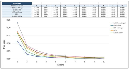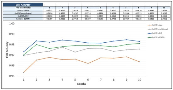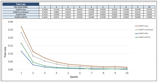 - Available RoBERTa models. RoBERTa is available in base and large versions, with all models being case sensitive. Additionally, there are multilingual variants, such as the xlm-roberta-base model, which was designed as a cross-lingual language model based on RoBERTa to operate effectively in 100 different languages and pre-trained on an extensive dataset of 2.5 TB of filtered CommonCrawl data [73].Furthermore, there are specialized RoBERTa models that have been pre-trained on comprehensive Spanish-language corpora. For example, the bertin-roberta-base-spanish model that was developed as part of the BERTIN project [74] and utilizes the mC4 corpus [75], a multilingual variant of the C4 dataset supporting over 100 languages sourced from the public Common Crawl web scrape. This dataset includes a total of 6.6 billion pages, with 416 million of them in Spanish [76]. Additionally, the roberta-base-bne model was created in 2021 by the Barcelona Supercomputing Center on 570 GB Spanish-language high-quality documents extracted from the National Library of Spain (BNE) (The acronym BNE in the model name RoBERTa-BNE refers to the Biblioteca Nacional de España in Spanish (National Library of Spain in English). Its website is https://www.bne.es/en (accessed on 1 November 2023).) using the supercomputer MareNostrum4 [77].