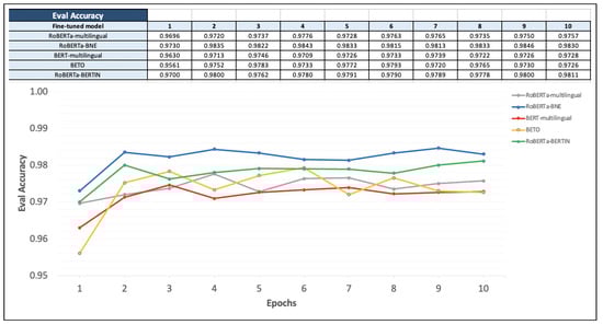 - Initially, the pre-trained models are loaded using the relevant Hugging Face classes (e.g., RobertaForSequenceClassification for the RoBERTa-BNE model), and the number of labels is set to two for our fake news detection task. The entire model is fine-tuned without freezing any layers, allowing all layers to be optimized during training to fully adjust to the binary classification task.