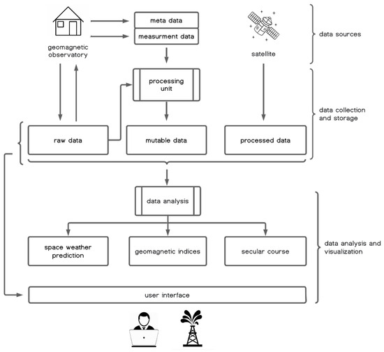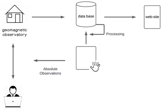 This leads to the need to create systems for processing geomagnetic data in real time. Today, in the Russian Federation, there is the only full-fledged system for collecting, storing, and promptly processing geomagnetic data, MAGNUS (Monitoring and Analysis of Geomagnetic aNomalies in Unified System) [http://mag.gcras.ru/] (accessed on 3 September 2024), created and operating at the Geophysical Center of the Russian Academy of Sciences (GC RAS). The basic functional diagram of MAGNUS is shown in Figure 1.