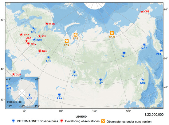 Map of geomagnetic observatories in Russia and neighboring countries.