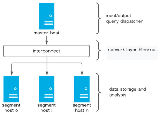 The main feature of systems built on Big Data technology is the implementation of parallel computing [36]. This allows the query to be distributed between several servers (segments) using the query optimizer (master) [37]. The concept of the system is shown in Figure 3.