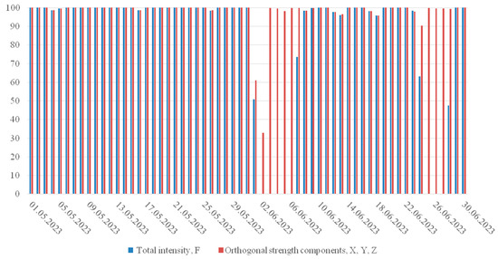 Volume of available data (in percent) from the Klimovskaya observatory in the period from 1 May 2023, to 30 June 2023.