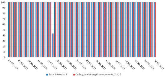 At the same time, we also have the opportunity to quickly obtain information on the availability of data for one observatory for the desired period of time. Figure 5 and Figure 6 show histograms with information on the volume of data for the Mikhnevo (MHV) and Klimovskaya (KLI) observatories per day for the time period from 1 May 2023, to 30 June 2023. The gap in the data on June 2 and 6 is due to technical problems with the scalar magnetometer after power failures. The synchronous absence of data from the scalar (F) and vector (X, Y, Z) magnetometers is due to power failures that affected all devices at once.