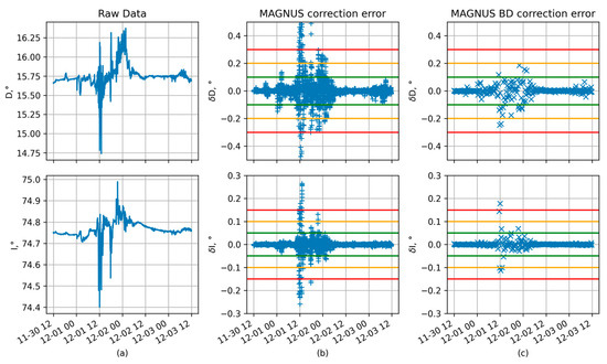 Declination and inclination of the B vector during the magnetic storm of 1–3 December according to the Klimovskaya magnetic observatory (KLI) (a), correction error via MAGNUS (b), correction error via MAGNUS BD (c). The lines on the graphs (b,c) show the thresholds of the ISCWSA error requirements: 1σ (green), 2σ (orange), 3σ (red).