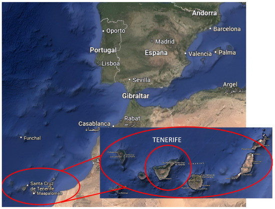 Tenerife, Canary Islands, with an area of 2034.38 km2 and a population of 944,107 inhabitants is the largest and most populated island in Spain. Located in the Atlantic Ocean and close to the African coast (see Figure 1), Tenerife is one of the European Union’s outermost regions.
