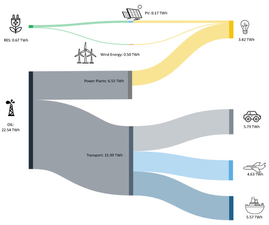 A basic representation of this isolated energy system is depicted in Figure 2, developed with the most recent published data (2022) [38]. Oil (mainly heavy fuel oil, diesel, and petrol) is the dominant primary energy source, exceeding the 22 TWh of energy import. The two main demand sectors are power-generation (29.06%) and transportation (70.94%). Oil consumption in the industrial/service sectors and LPG, although existent, has been omitted as its values are relative low. Renewable sources (mainly WE and PV) only represent 2.8% of the total primary energy consumption, making clear the great dependence on fossil fuels across all sectors.