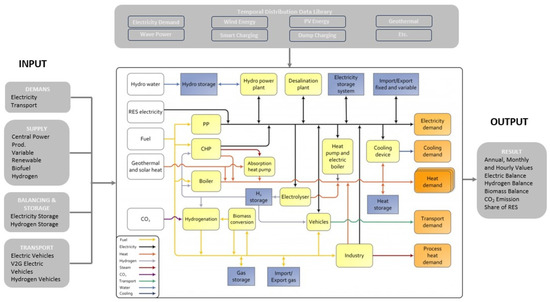 EnergyPLAN model structure. Definition of inputs/outputs. Adopted from [51].