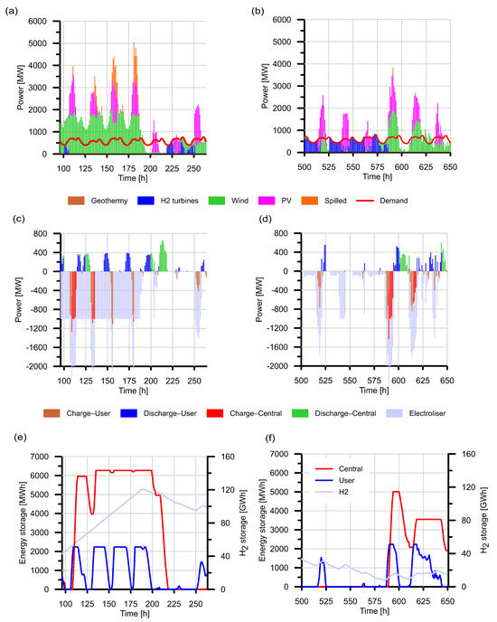 - The dispatchable power injection would be provided by a high-enthalpy geothermal system (see capacities in Table 3) and gas turbines fuelled with H2. Neither baseload nor grid stability restrictions were considered in this work. The large amount of energy storage capacity, generation unit hybridisation to provide primary and secondary control reserves [62,63], or the development and deployment of power electronics [64] support this hypothesis.