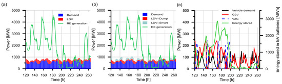 Impact of LDV demand on the grid system: (a) only dump charging considered, (b) smart charging for 30% of the fleet, and (c) example of bidirectional smart charging operation.