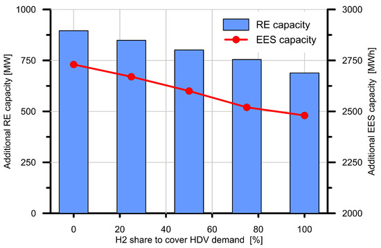 As the reader can expect, the power-generation structure that provided the annual results previously shown in Table 6 is insufficient to cope with the additional LDV fleet demand. Further contribution of dispatchable sources (H2 turbines) will be required, which means more H2 production requirements and, therefore, more electricity to feed the electrolysers. This behaviour turns into a snowball effect, preventing both sectors to meet the goals of decarbonisation with an autonomous energy supply. In order to provide an estimation of the additional resources required to cope with the demand, the RE power and energy storage capacities were increased based on the following criteria: