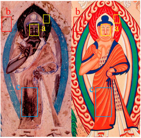 Comparison of the copy restoration of Cave 249 (Western Wei dynasty) of the Mogao Caves (yellow box “a” is fading color; red box “b” is peeling skin; blue box “c” is de-powdering).