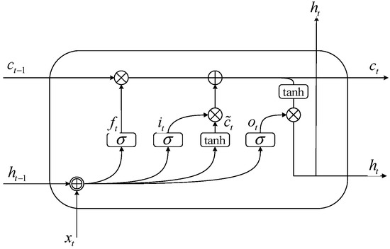 LSTM is a type of recurrent neural network (RNN) with memory functionality that was proposed by Hochreiter and Schmidhuber in 1997. Compared to traditional RNNs, LSTM incorporates memory cells that allow for the discrimination of useful information [12]. As shown in Figure 2, LSTM consists of four “gates” for information processing: the forget gate , input gate , output gate , and a memory cell .