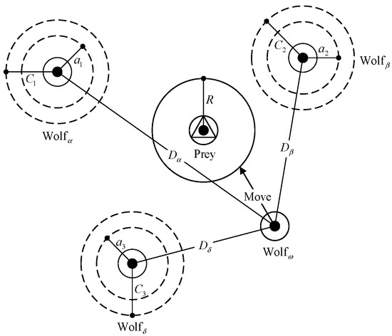 where is a convergence vector that gradually decreases linearly from 2 to 0 as the number of iterations increases; and are the random vectors whose elements are taken as [0, 1]; and is the random number of [0, 2], indicating the weight coefficient occupied by the prey. After the wolf pack has completed the encircling process, with the wolves being the closest to the prey, the remaining wolves in the pack (represented by vector ) start hunting and gradually approach the prey. By improving the traditional distance formula in Equations (7) and (8) to a distance formula with two positional attributes, the positional update formula for the wolves in wolf packs α, β, δ, and ω can be expressed as follows: