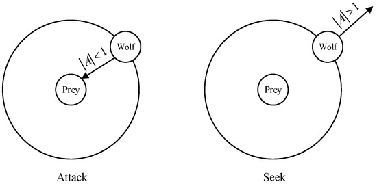 Finally, as the gray wolves gradually approach the prey, the vector linearly decreases from 2 to 0. The elements of vector fluctuate within the range . When , the prey has stopped moving, and the wolves pack attack the prey to achieve a global optimum and optimize the parameter values. However, if , the wolf pack starts searching for new optimal positions to avoid becoming trapped in local optima [18]. This process is illustrated in Figure 5.