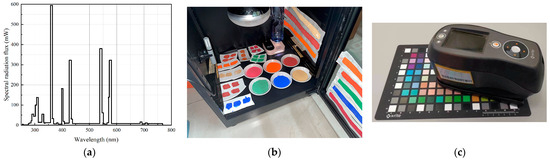 Spectral distribution curve of light source (a), and fading samples and experimental equipment display diagrams (b,c).