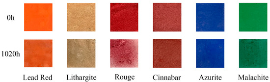 After prolonged exposure to light, all six pigments exhibited uneven color patches on the surface. As shown in Figure 9, lead red and lithargite exhibited dark patches on their surfaces, particularly lithargite, which changed from its original bright yellow color to a deep brownish coffee color. Rouge showed the most severe damage, with partial cracking and significant fading. The cinnabar had a dark layer covering its entire surface. Azurite had relatively minor changes, with a few white patches on the surface. Some areas of the malachite pigment transformed from white light green to dark green.
