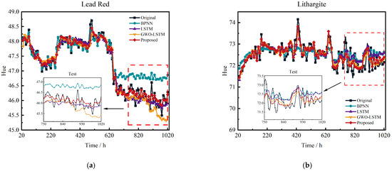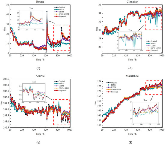In our study, optically simulated aging experiments were conducted on six pigments: lead red, lithargite, rouge, cinnabar, azurite, and malachite. The hue (h), lightness (L), and chroma (C) were predicted for each pigment. Table 3 presents the training accuracy of the BPNN, LSTM, GWO-LSTM, and GWOAD-LSTM models and contains the results of RMSE, MAE, and MAPE for the hue (h). Figure 10 shows the results of the comparison between the six pigments’ predicted hues.
