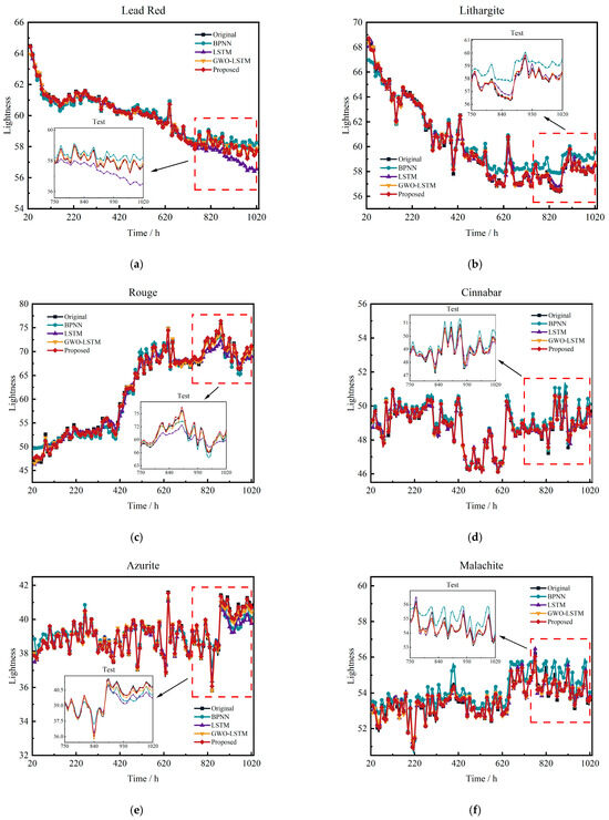 Comparison of the six pigments predicted lightness (L). Lead red (a), lighargite (b), rouge (c), cinnabar (d), azurite (e), and malalchite (f), respectively. (The subfigure shows the prediction results for the test set from 750 h to 1020 h.)